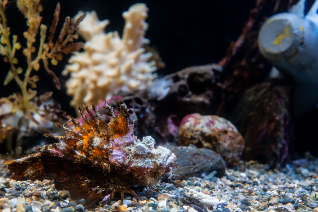 青い照明の水槽が多かったので、撮影は手前側のエリアの青くない水槽がメインでした。
