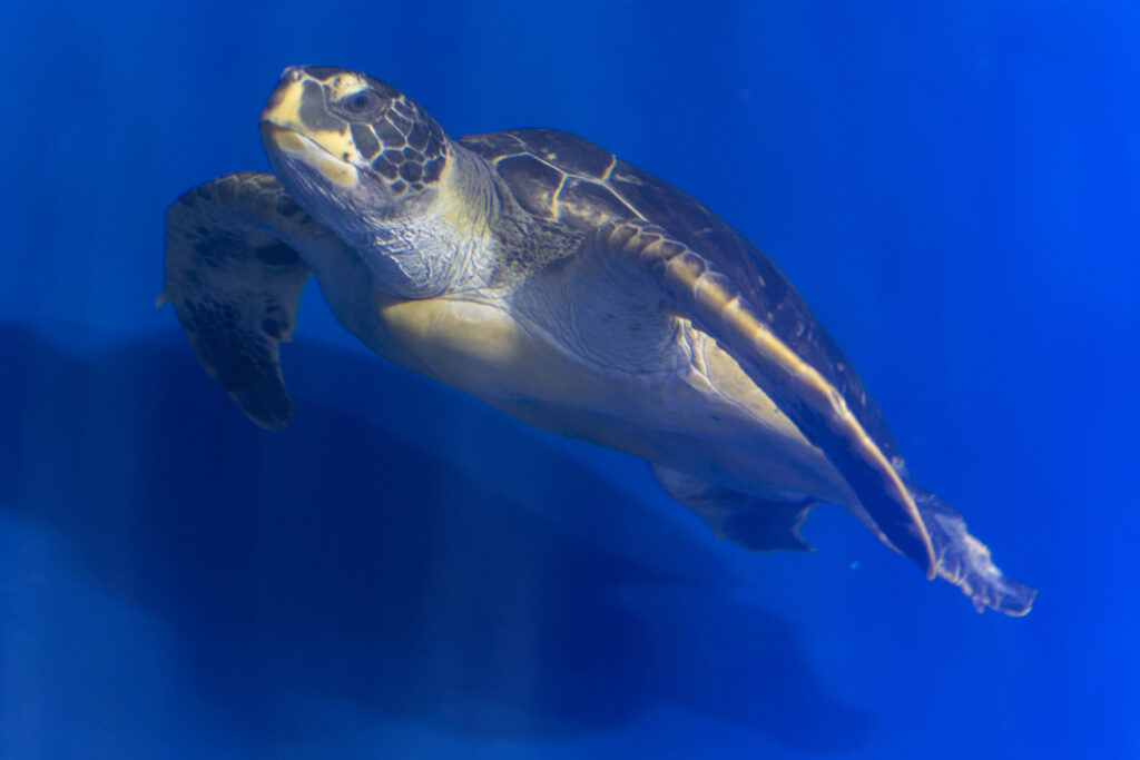 トンネル水槽内にいるアオウミガメの「カメ吉」。実はメスなんだとか。