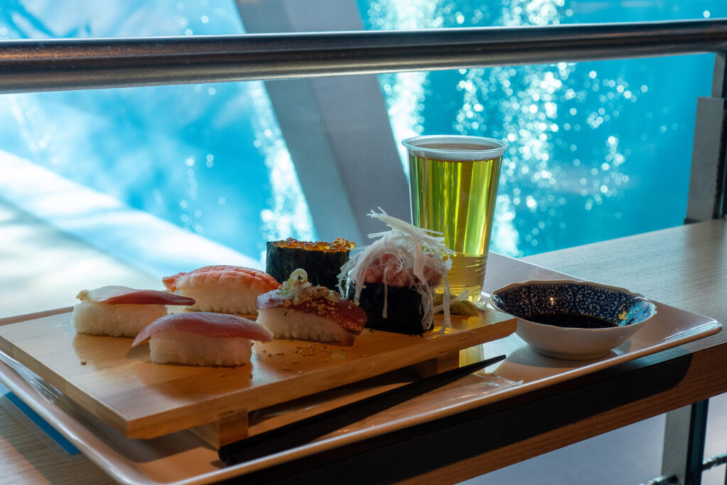 休日には大水槽前に鮨処「潮目の海」がオープンします。味の方はさておき、「水族館でお寿司を食べながら魚が見られる」ってちょっと素敵な体験ですよね。ビールが美味え。