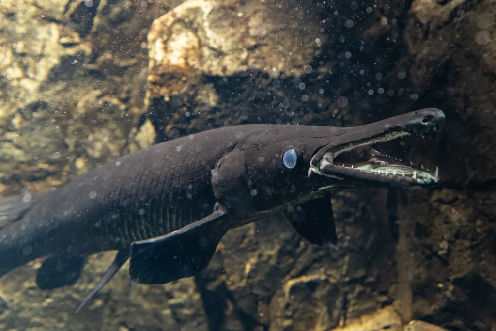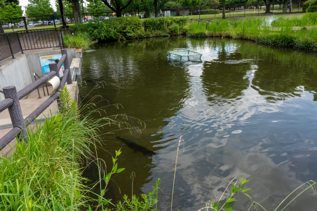 実は水族館外の池にはヘラチョウザメがいます。ぜひ探してみてください。