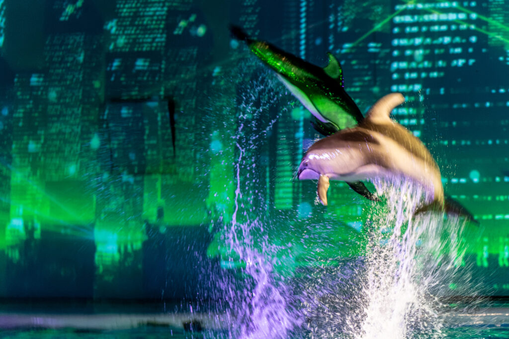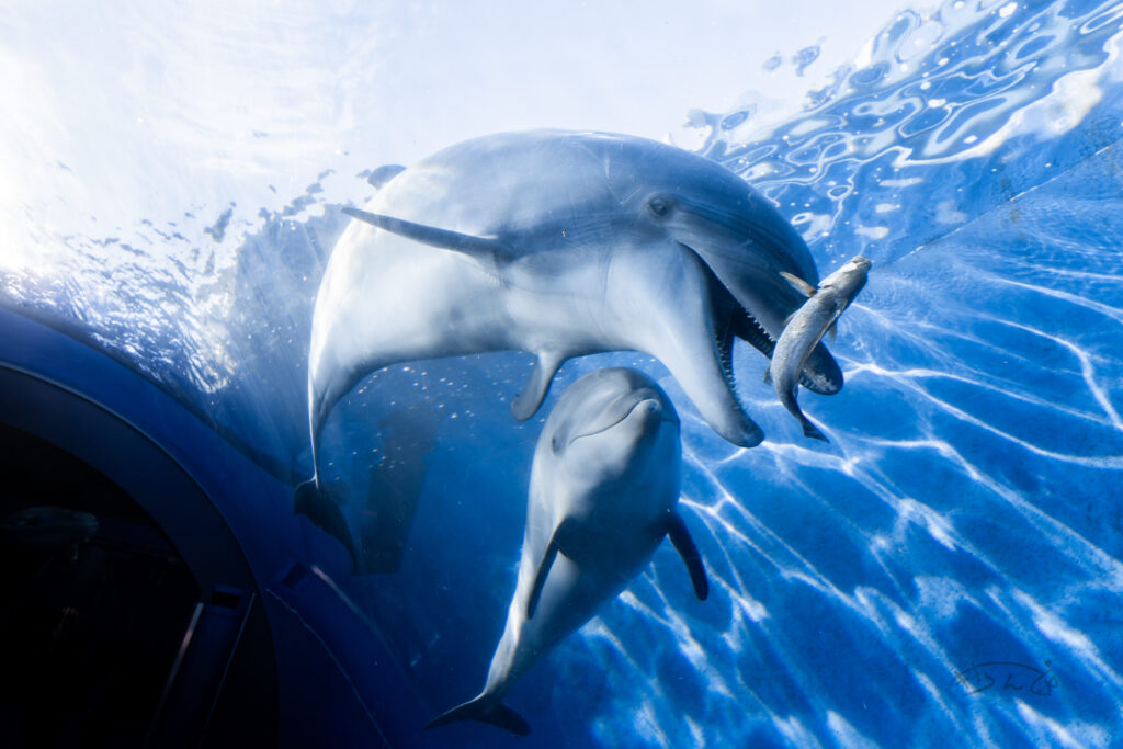 本館の隣にある、「ドルフィンファンタジー」は、イルカが暮らすトンネル水槽と、奥にある円柱水槽で構成されています。この円柱水槽には、昔はイロワケイルカが展示されていました。施設の名前はその頃の名残りでしょうか。
