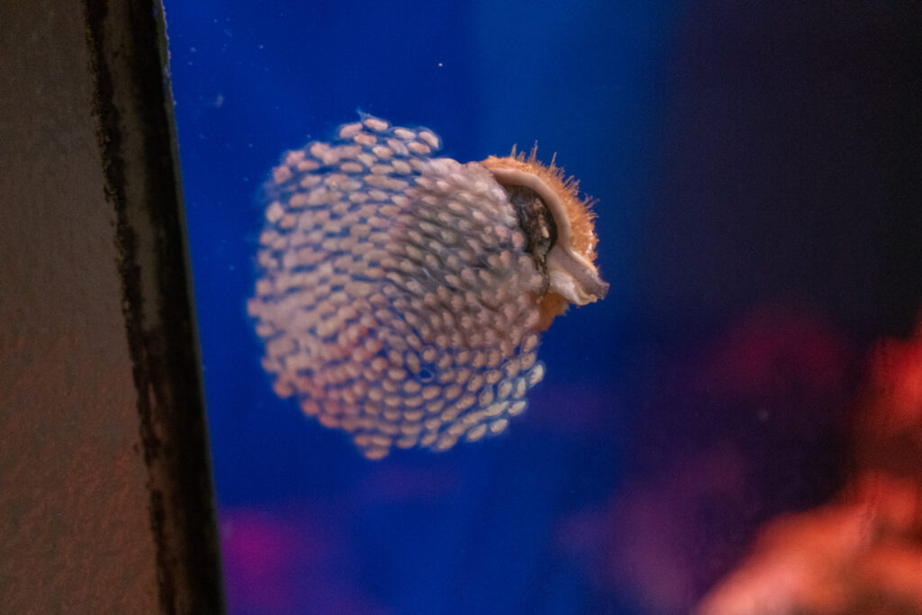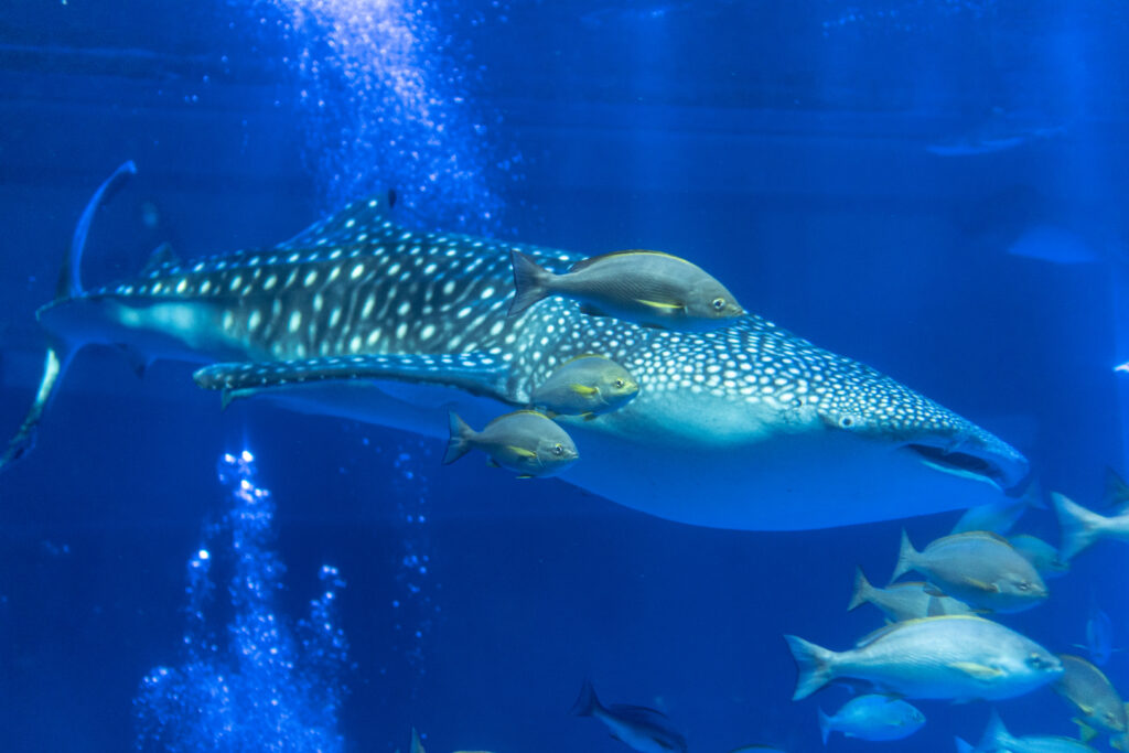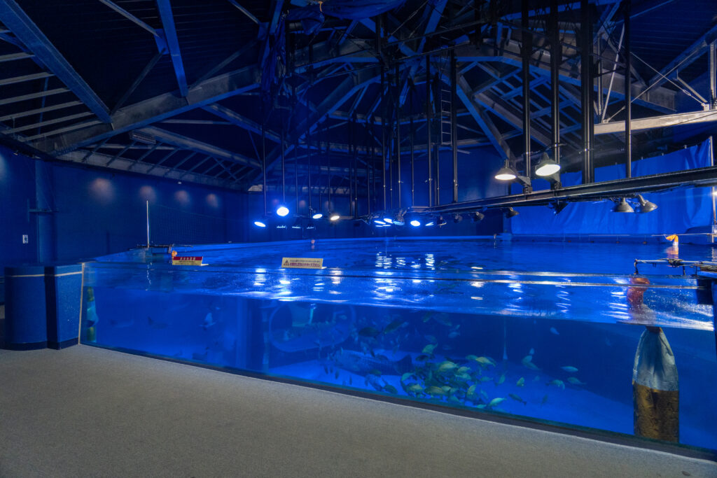 水槽の照明が青いといきものの色がちゃんと出ないのであんまり好きではないですが、ここのとじま水族館では「ジンベエザメ 青の世界」と称して、日本海側の水族館で唯一ジンベエザメを展示しています。