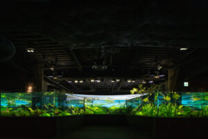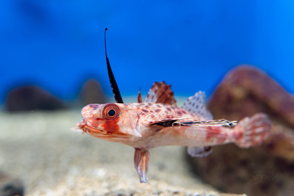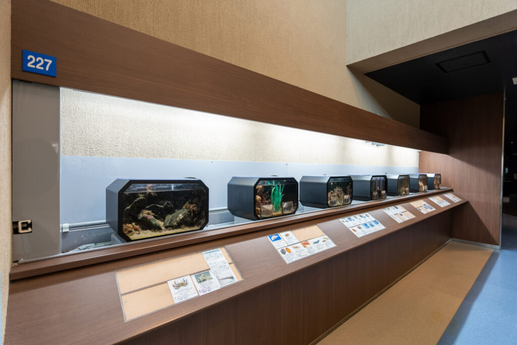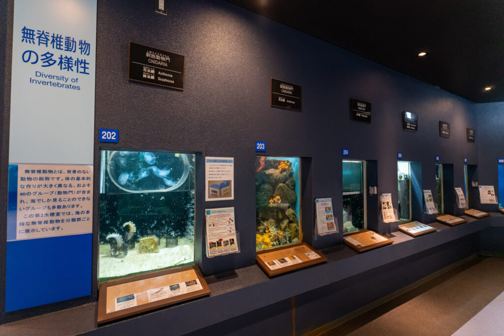 素晴らしいことに、左側の水槽、全部無脊椎動物が分類ごとに展示された個水槽です。あと、そんな無脊椎動物の水槽にはやたらカゴカキダイが入っていました。イソギンチャク掃除要員とかですかね。