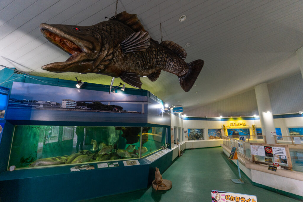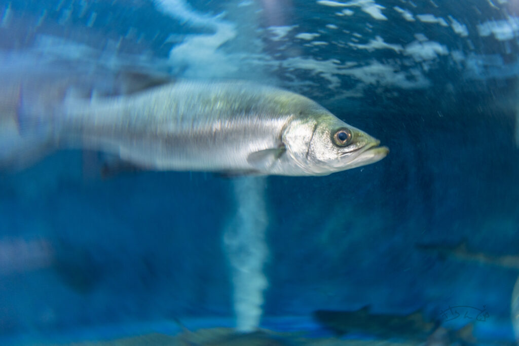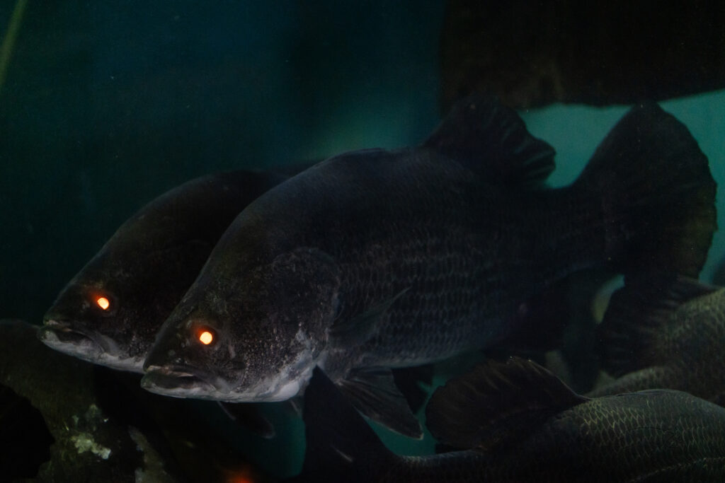 高知県を代表する魚、アカメ。ライトで目を照らすことができたので、左手でライト、右手でカメラを持ちつつ体全体でガラスの反射を防いでなんとか撮影しました。