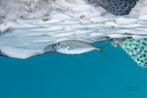 イシガキフグの下にくっついて泳いでいました。コバンザメみたいな暮らし方してるんですね。砂地で群れになって泳いでいるのも見たことがあるし、神出鬼没です。 シロワニにくっついていたこともありました。
