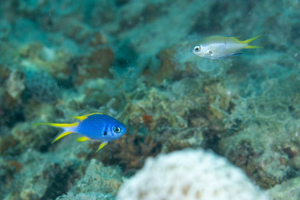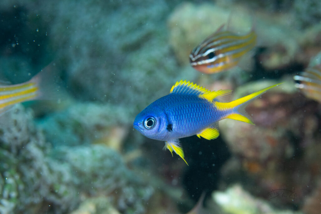 元々モンスズメダイとされていたヤツの青いタイプに、別の和名がついたらしいです。色合いが綺麗ですね。
