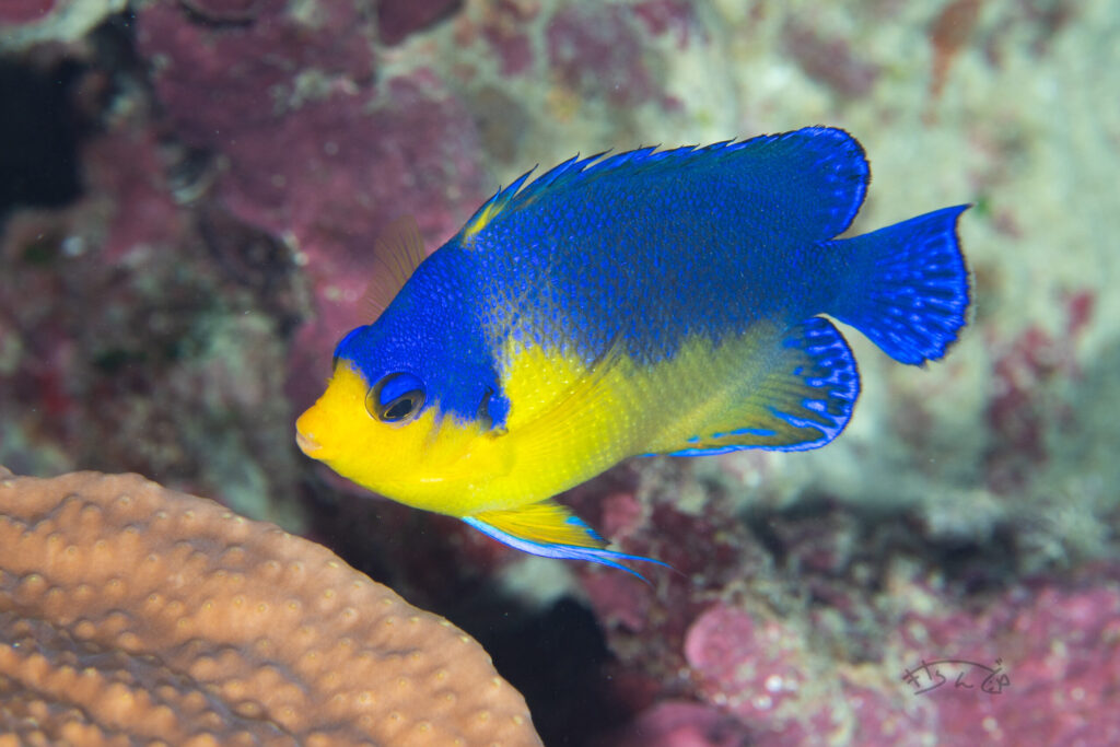 スミレヤッコ 2026年4月25日 最終更新日時 : 2026年4月25日 きさらんど 2026.04 沖縄 青と黄色のツートンカラーが素敵なキンチャクダイです。ソメワケヤッコは体の前半分と後ろ半分で青と黄色ですが、コイツは上半分と下半分でわかれています。 壁際で出会ったので、すぐ穴の中に入る上に一生真横を向いてくれませんでした。ちくしょう。 X
