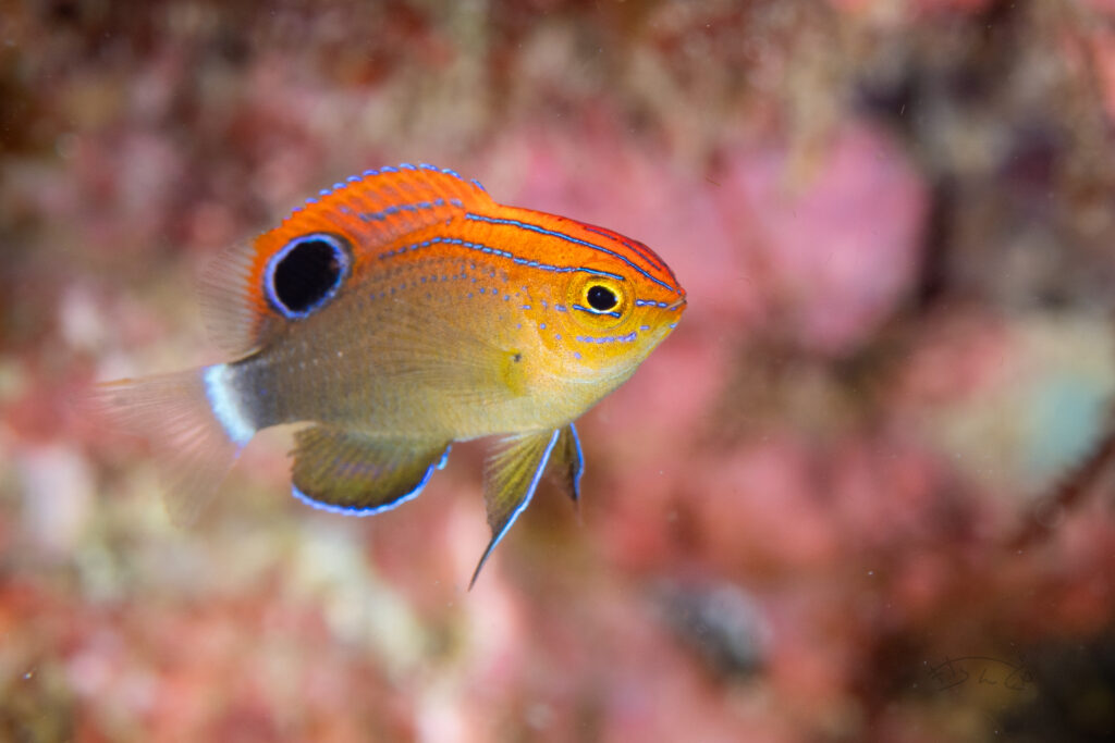 尾びれの付け根が白いのがメガネスズメダイ、白くないのがクロメガネスズメダイと習いました。