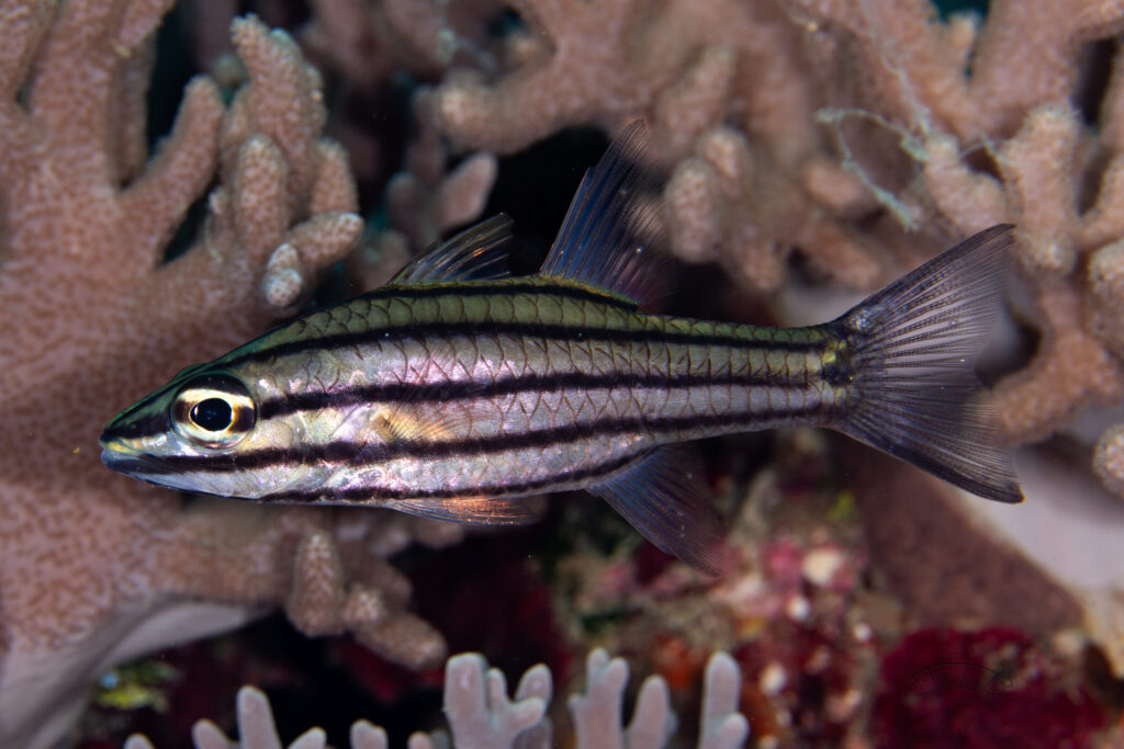 ヤライイシモチ 2026年4月20日 最終更新日時 : 2026年4月20日 きさらんど 2026.04 沖縄 体にある線の数は5本。お腹にも黒い線がしっかり入っているのが特徴です。ヤライイシモチ系って顔がとんがっているから「あ、アイツらの中のどれかだ」ってなるので良いと思います。とはいえそこから同定するの難しいんですけれどね。特に幼魚。 X