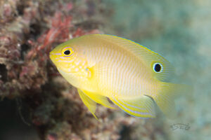 ネッタイスズメダイというのも別途いるようで、胸びれの付け根の黒い点とえらぶたの上の黒い点の大きさを比べるなどして見分けるらしいです。わからんって。 幼魚は背びれに目玉模様があるので見分けやすさレベル1です。やったね。